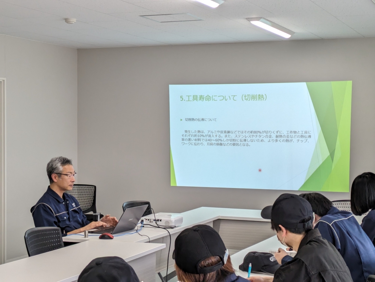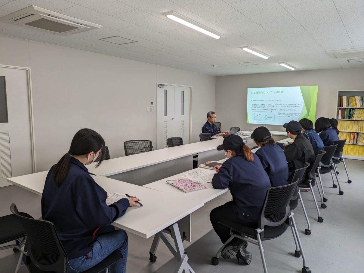 2024.04.23 若手社員向け勉強会を開催しました 4月22日午後より、若手社員勉強会を開催しました。 今回は「切削理論」について社長より講義を受けました。 今回の勉強会は、切削条件を知ることにより「技術」と「知識」のレベル向上を目指し、切削面の変更に対する「気づき」を学ぶことを目的としています。 切削加工についてより深い内容を学ぶことができたのではないでしょうか。 社員育成の一環として、今後も引き続き勉強会を開催していきたいと思います。